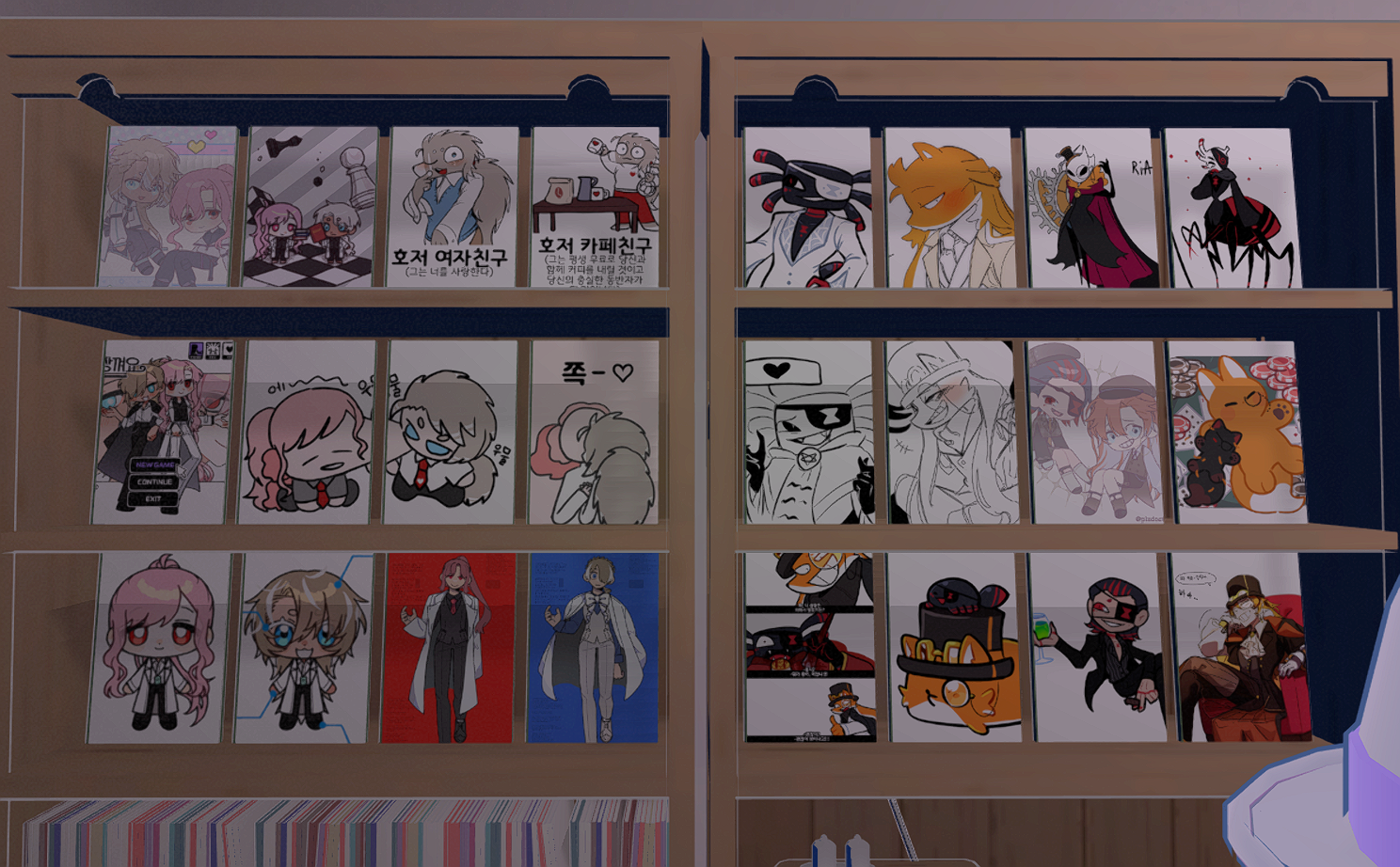 커미션들이랑 이벤트로 받은 그림도 넣고, 거미 캔뱃지는 내가 직접 그린 이미지다.