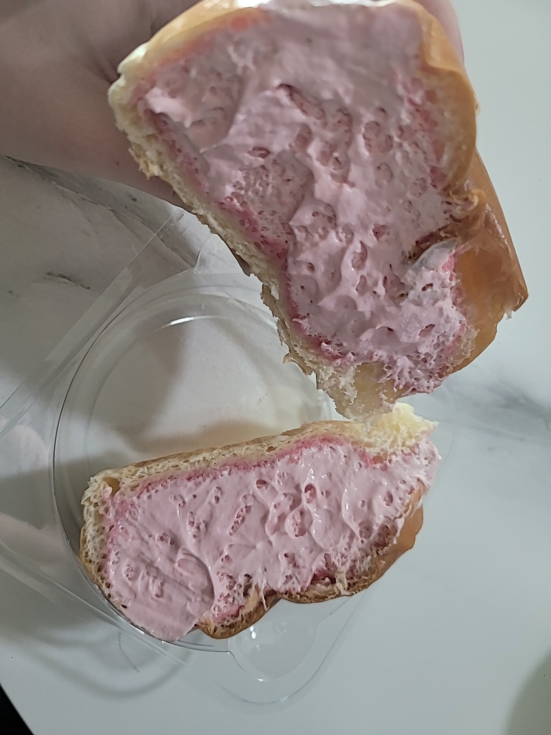 실제로 반 갈라서 본 크림색은 정말 예뻤습니다! 덜 느끼하면서 딸기맛도 잘 느껴져서 좋았고, 색도 고와 눈호강도 하고 좋네요.
